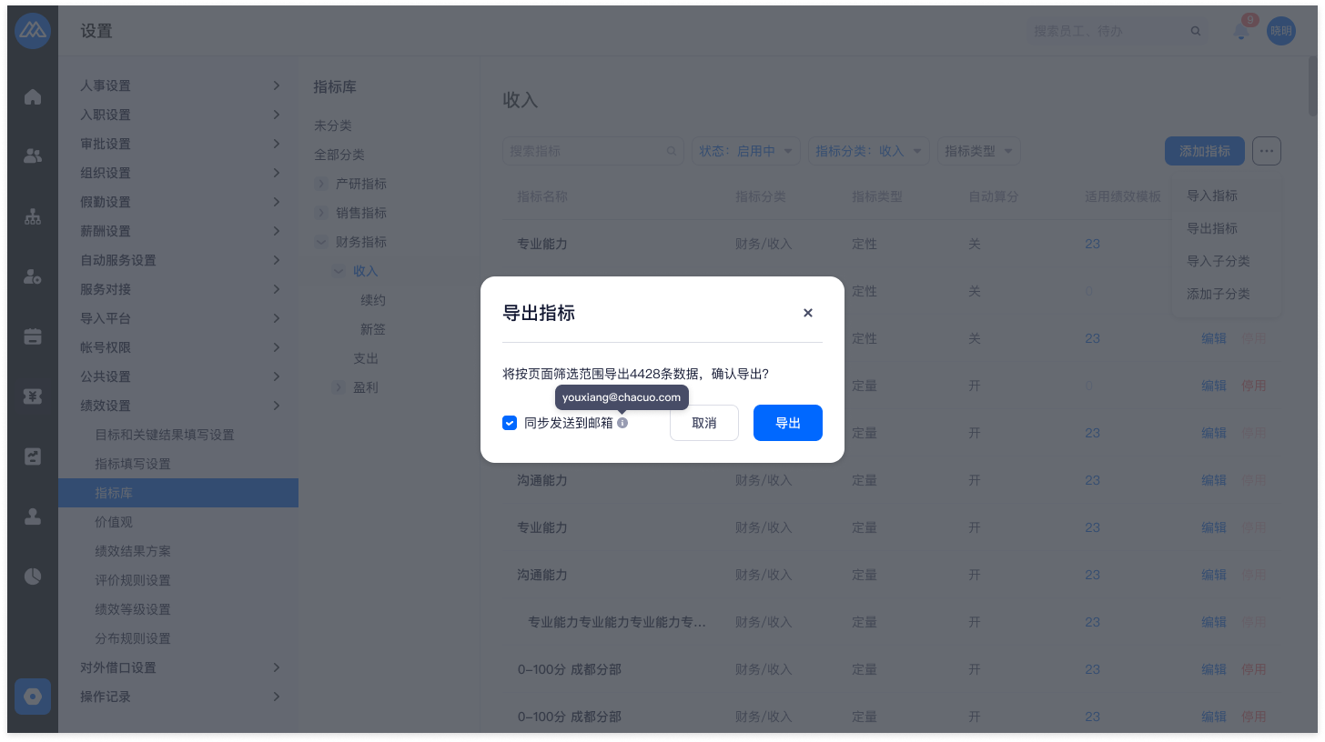 新增指标库导出按钮,支持勾选是否同步到邮箱