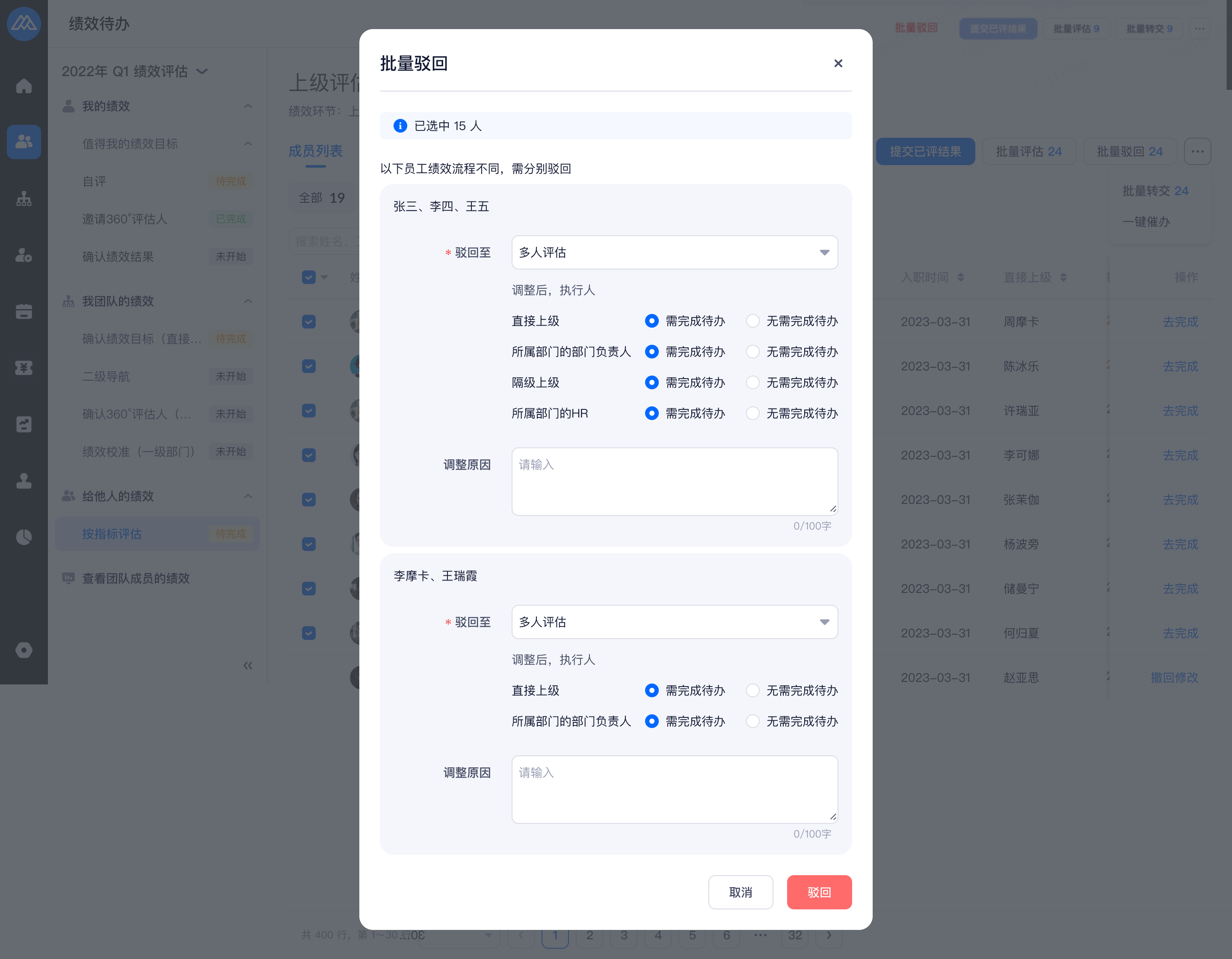 客户希望在绩效校准时,修改指标得分,但校准环节仅支持修改总分,借助评估环节(自动带出上一个环节的评价)来完成,会存在批量驳回的操作效率问题,当前仅支持点击详情再进行驳回