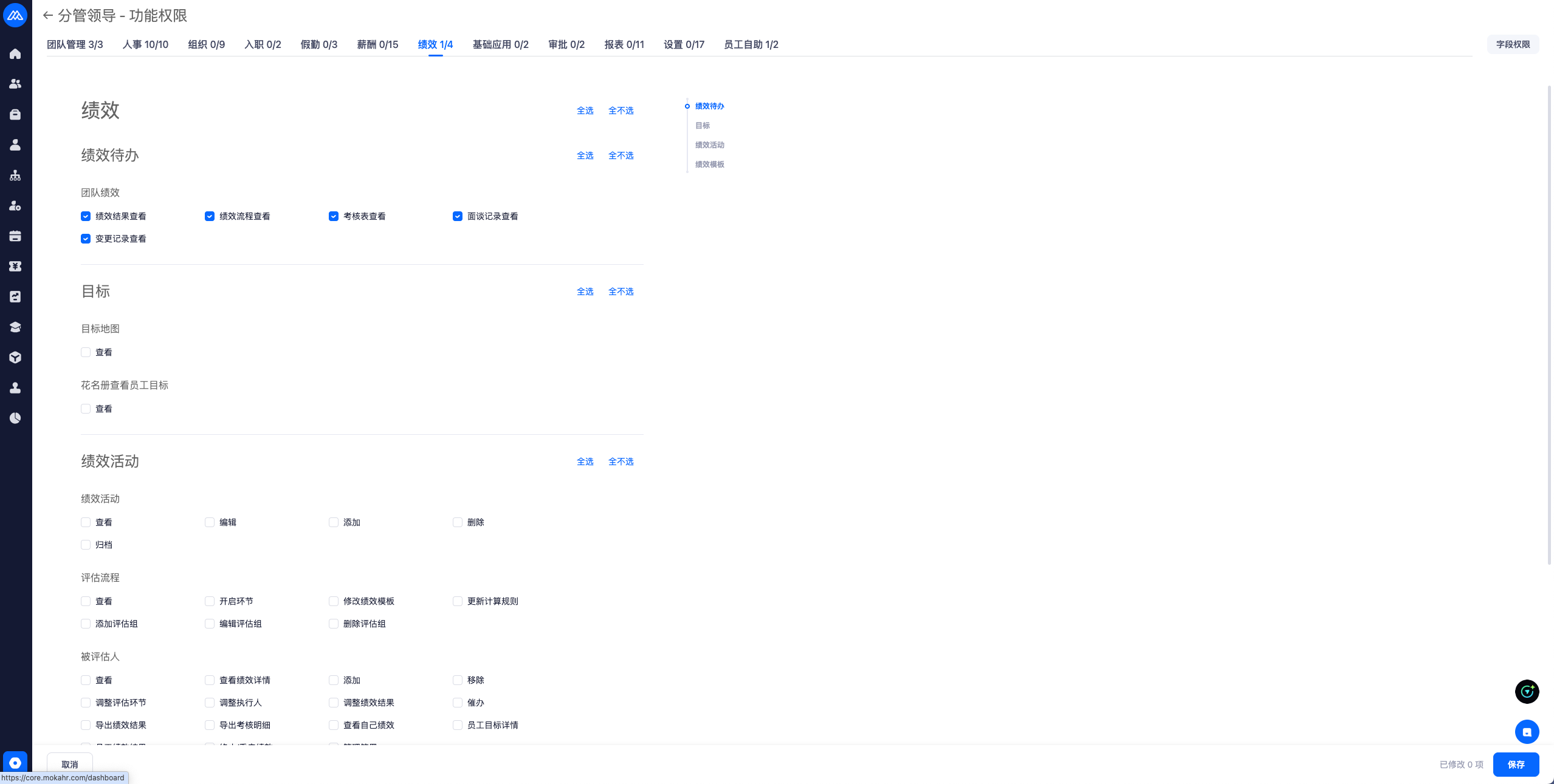 绩效活动-被评估人-查看绩效详情,增加权限细分,如果细分权限都取消勾选,查看联动取消勾选