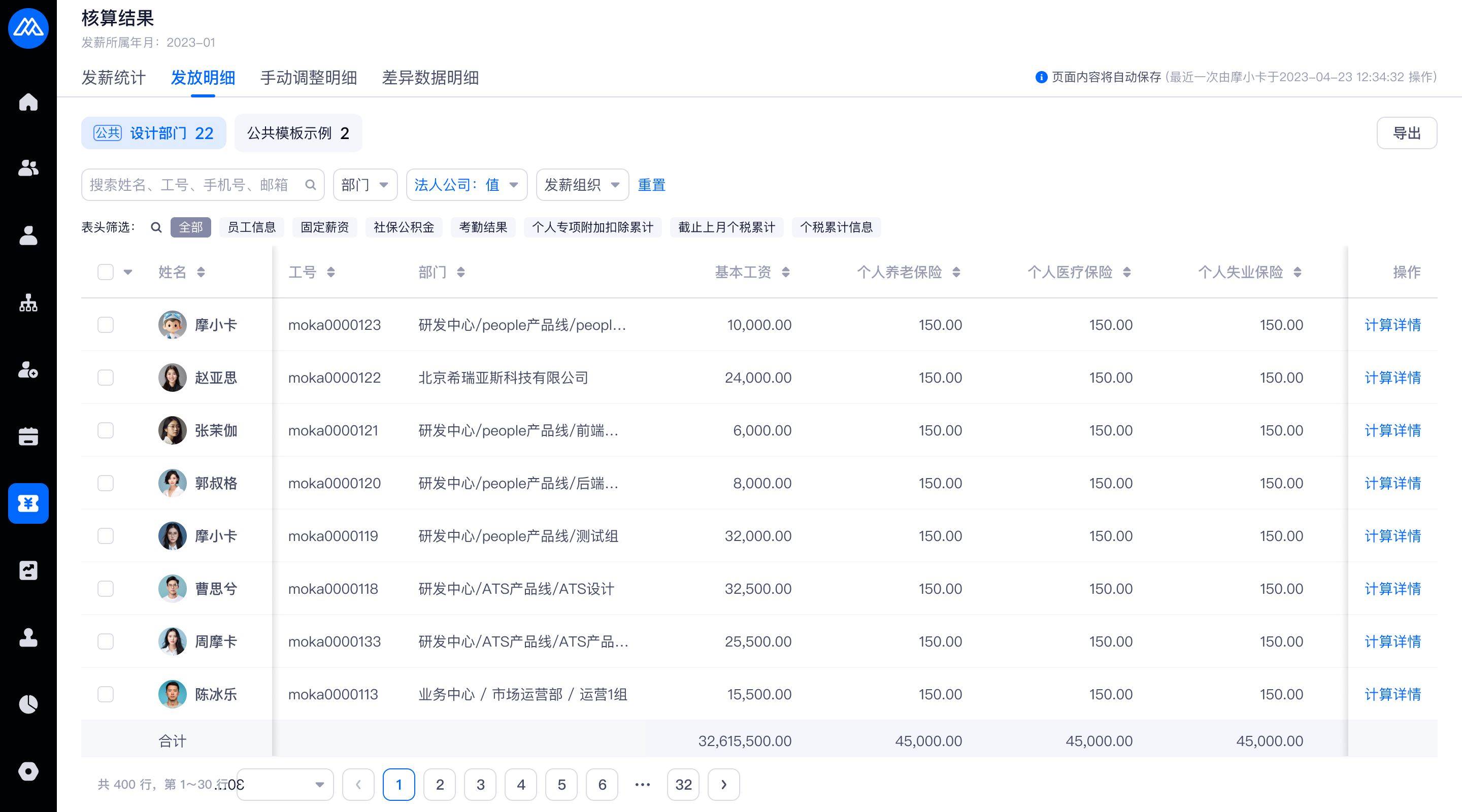 在薪酬核算规则中可以快速设置公共模板,也可以在【薪酬核算活动-发薪明细】中设置