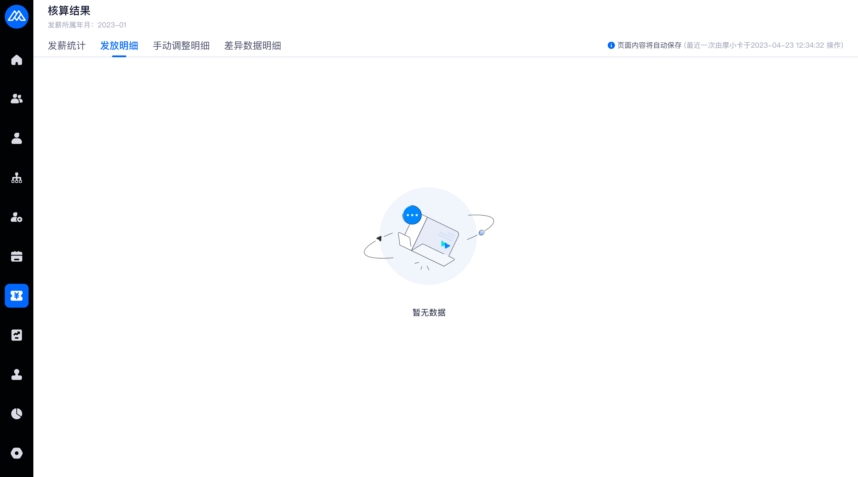 若选择【仅允许审批人查看指定的工资项】时,审批人无法查看到【薪酬核算活动-发薪明细-全部、本期调薪】的列表,只可已看见薪酬核算HR配置的公共模板