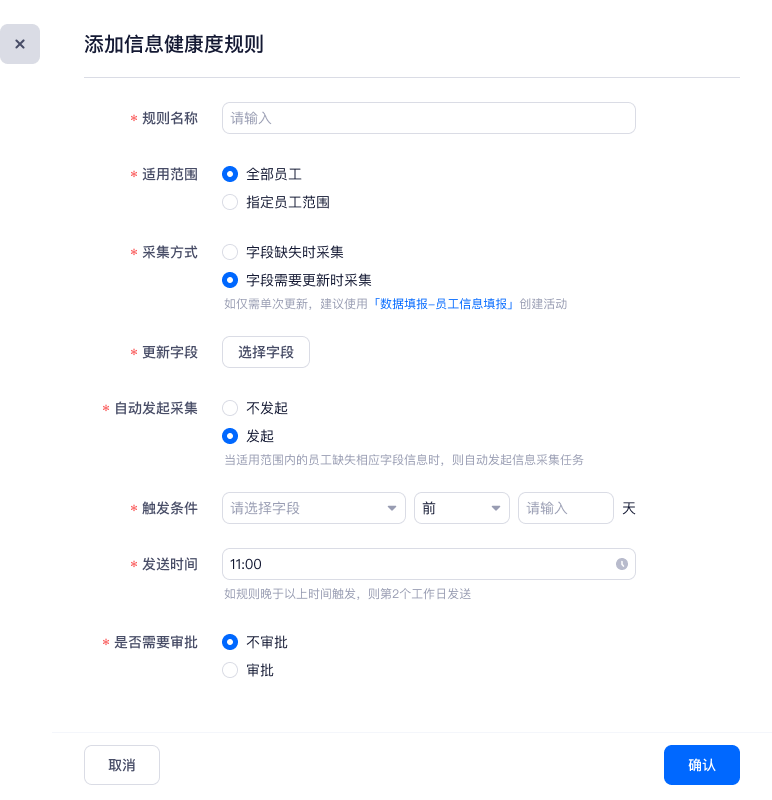 字段需要更新时采集:可在下方选择「更新字段」,配置「触发条件」。按照触发条件、发送时间为员工发送信息采集待办,可填写所有的更新字段。