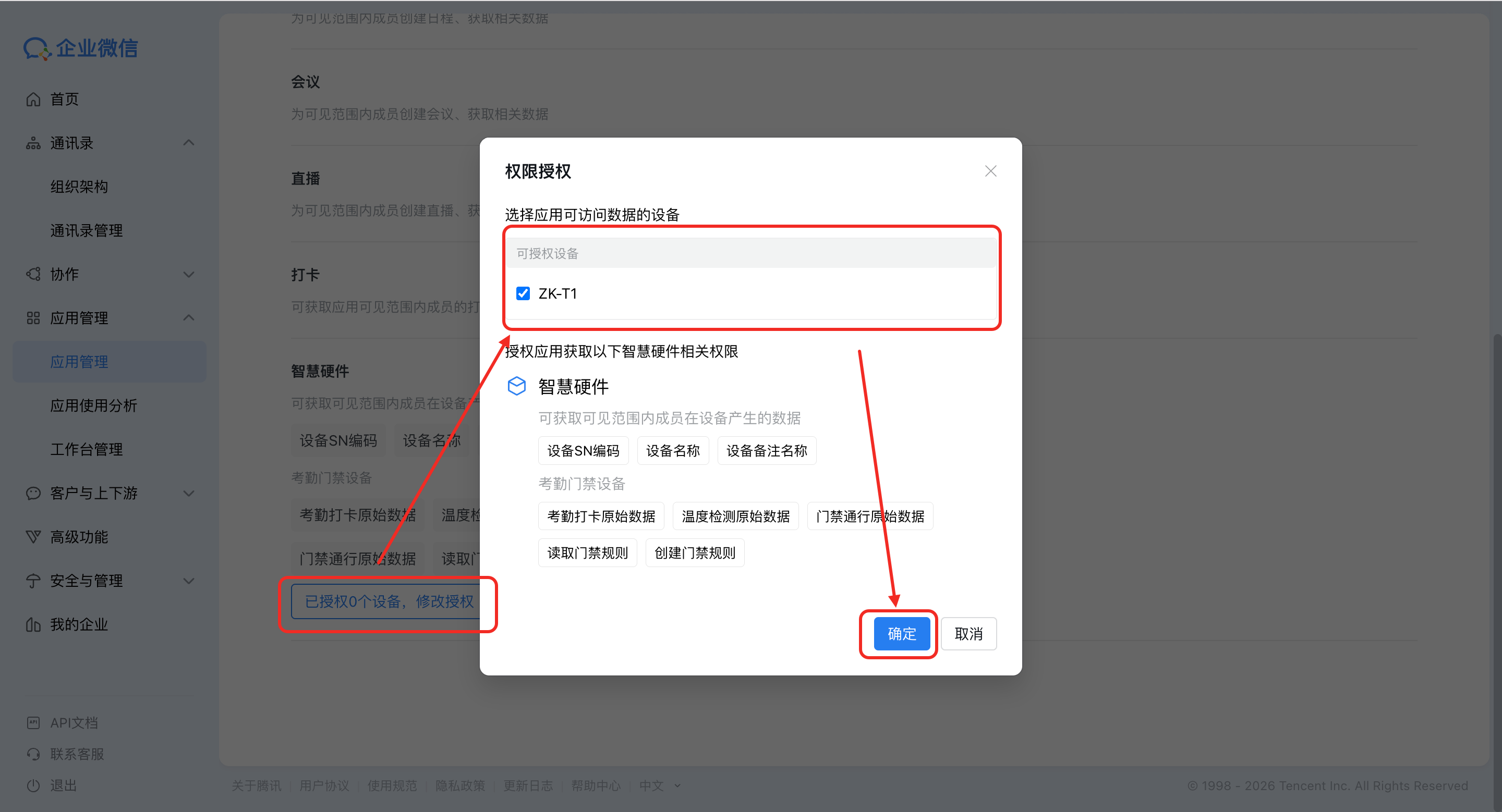 第二步:进入企业微信管理后台,点击MOK打卡应用,查看授权信息,授权相应的硬件设备,点击保存后即可正常使用。