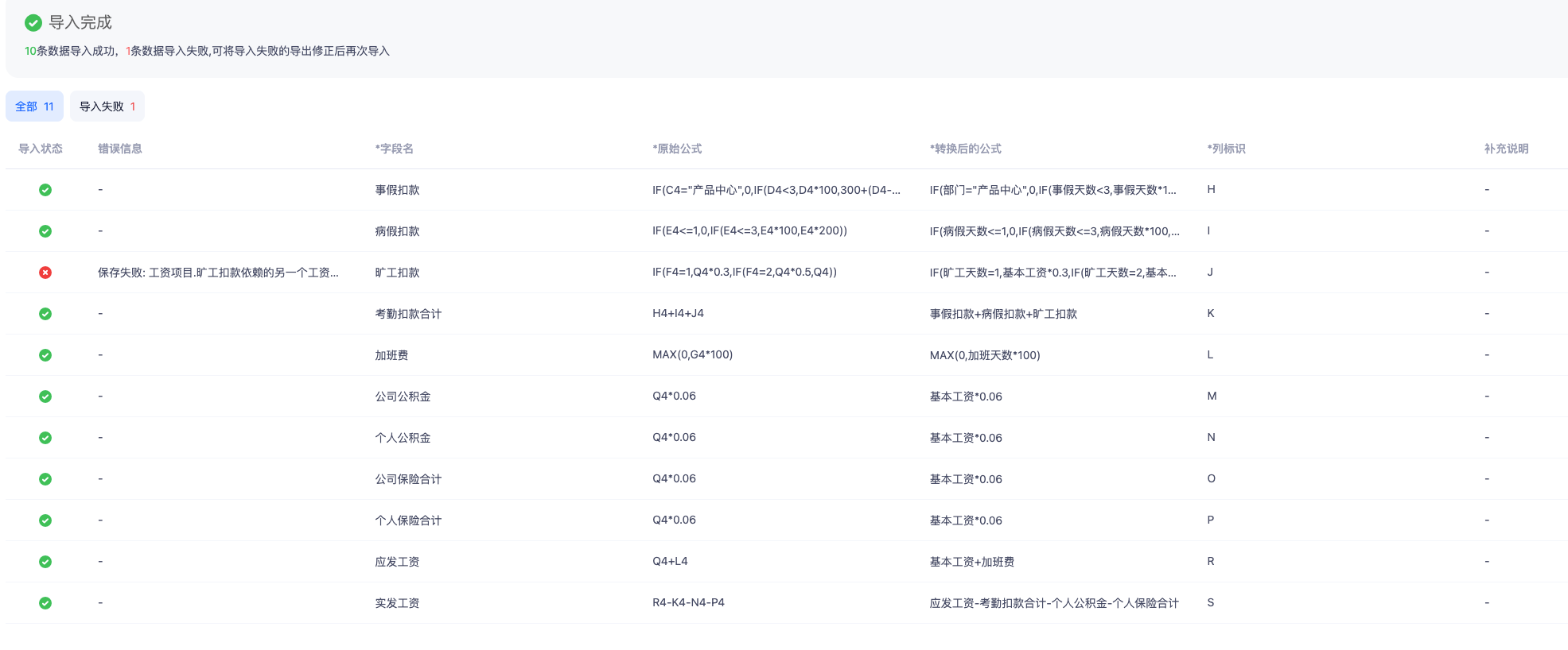 返回「核算规则」按工资项确认生成结果。若有问题建议人工修复或使用相关AI公式插件重新生成