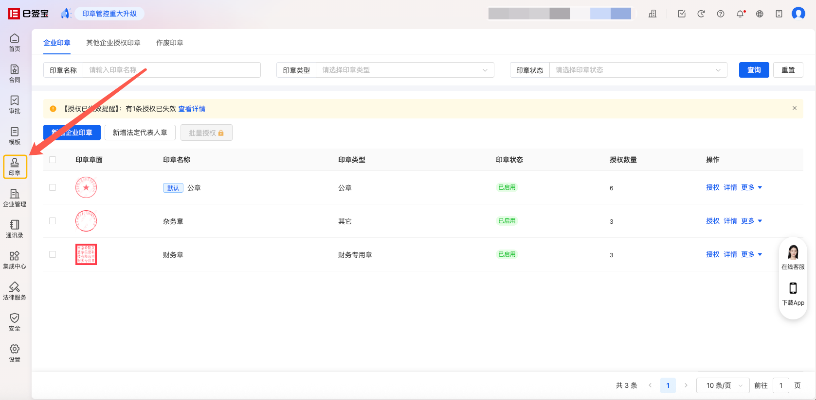 地址:https://web.esign.cn/enterprise/seal/seal-list/org