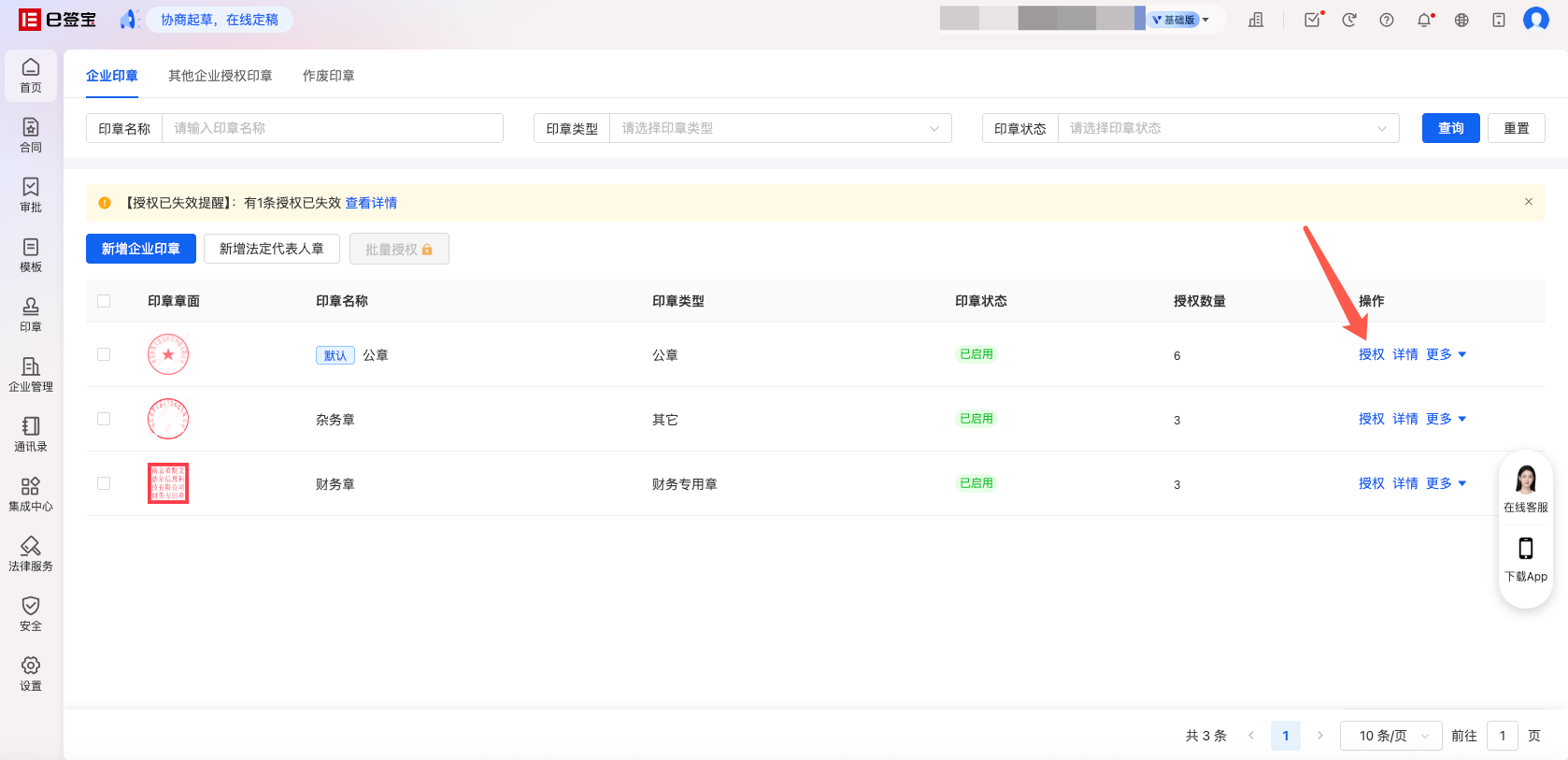 ps:如果没有授权按钮,需联系e签宝协助检查授权。