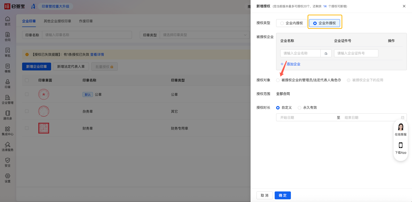 给授权印章绑定类型(印章类型会在合同设置中使用到)